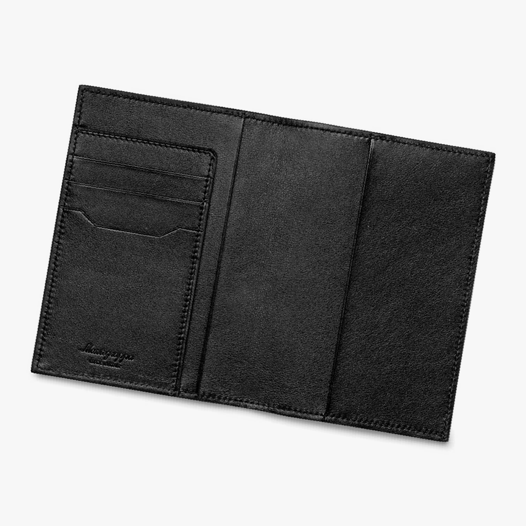 Estuche pasaporte 3 compartimentos Montegrappa Signet cuero y jacquard negro