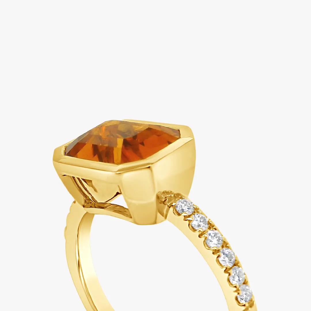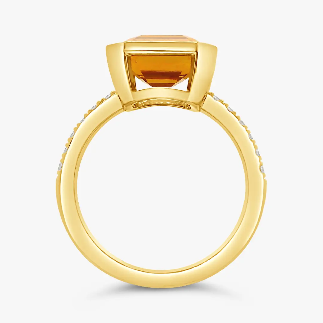 Este anillo en oro amarillo 18K destaca por una citrina de corte esmeralda engastada al bisel como piedra central. La argolla, adornada con diamantes corte brillante, desprende destellos que realzan la calidez y profundidad del anillo.