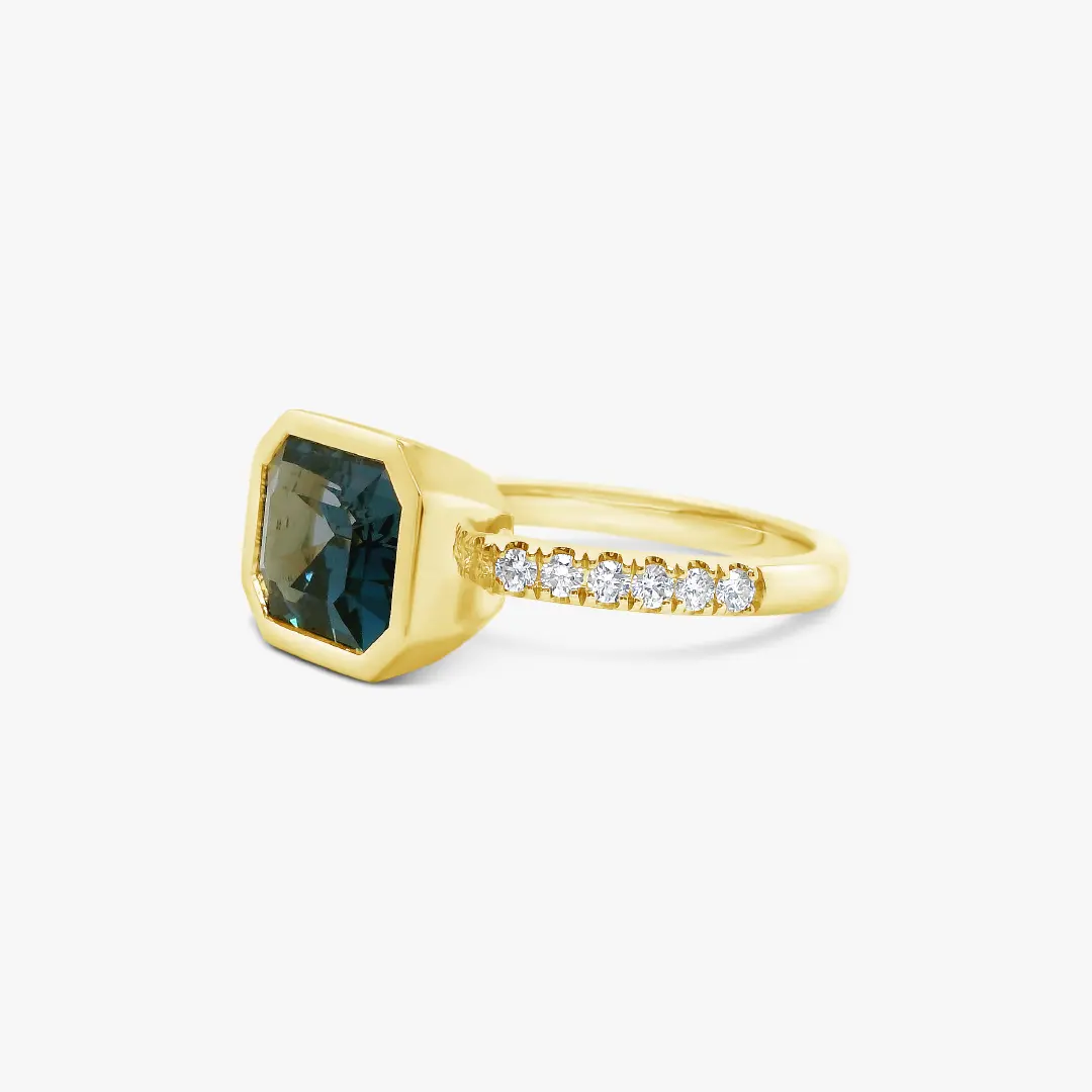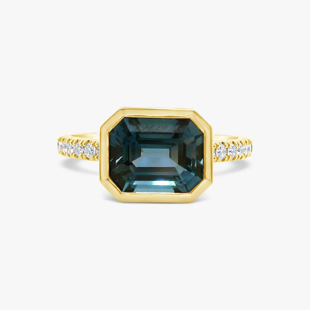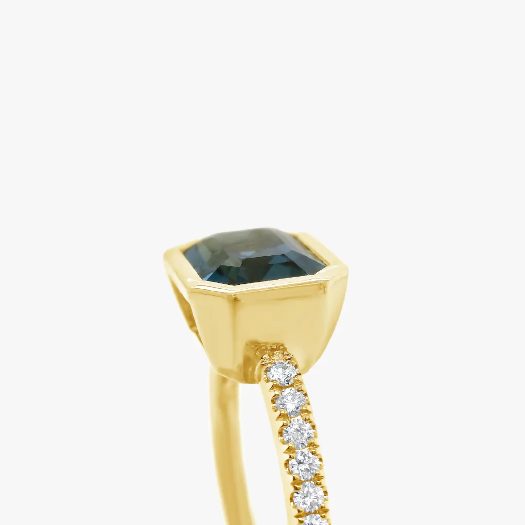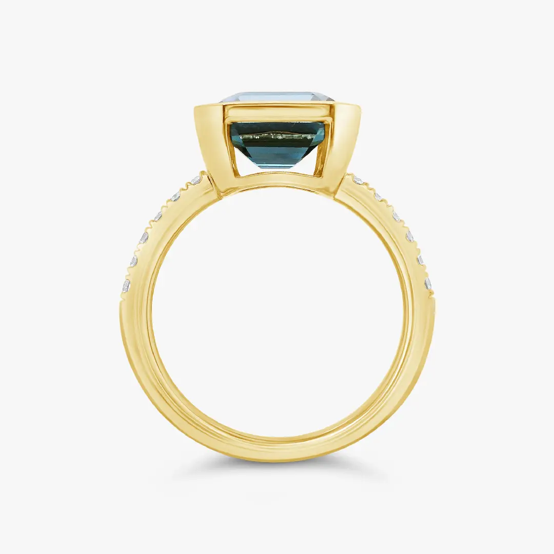 Este anillo en oro amarillo 18K destaca por un topacio de corte esmeralda engastado al bisel como piedra central. La argolla, adornada con diamantes corte brillante, desprende destellos que realzan la calidez y profundidad del anillo.