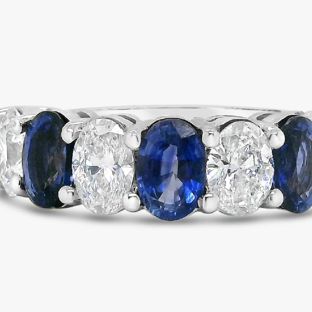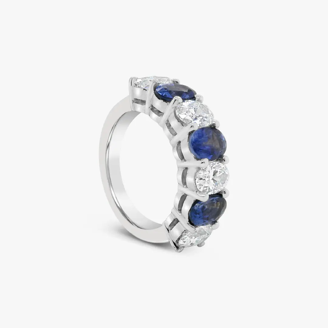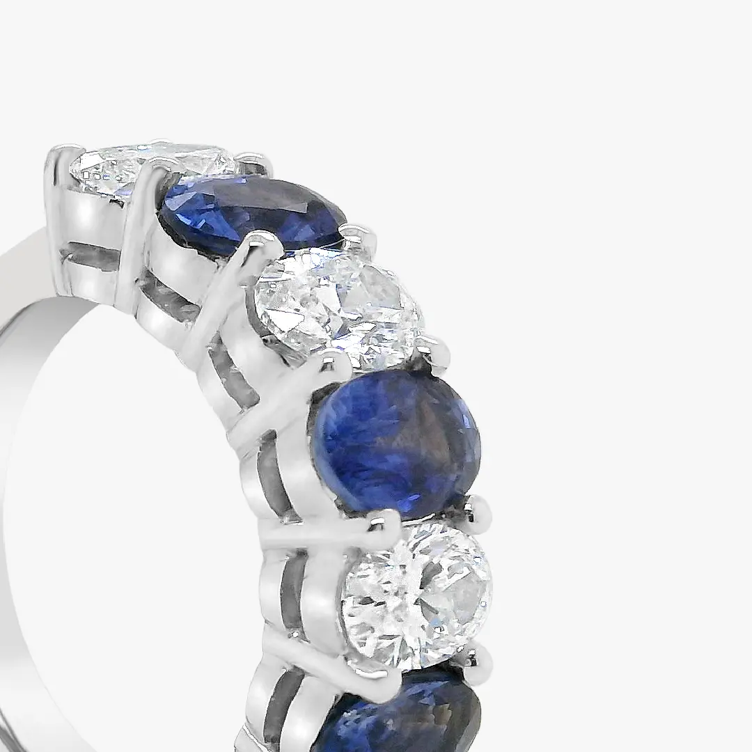 Esta argolla en oro blanco de 18K exhibe una secuencia equilibrada de zafiros y diamantes ovalados engastados hasta la mitad de la pieza. Su brillo alternado crea un juego de luz sutil resaltando el carácter atemporal del diseño.