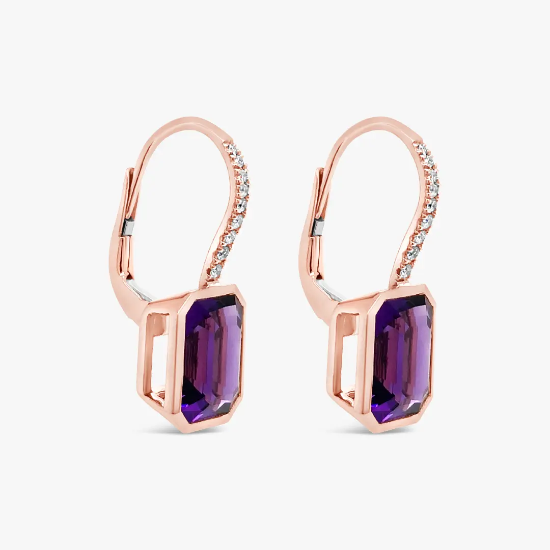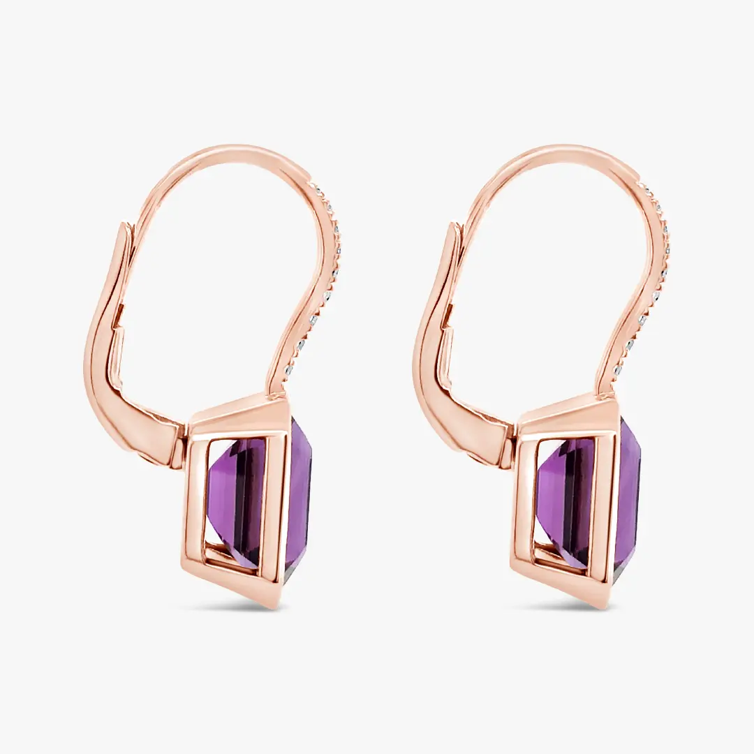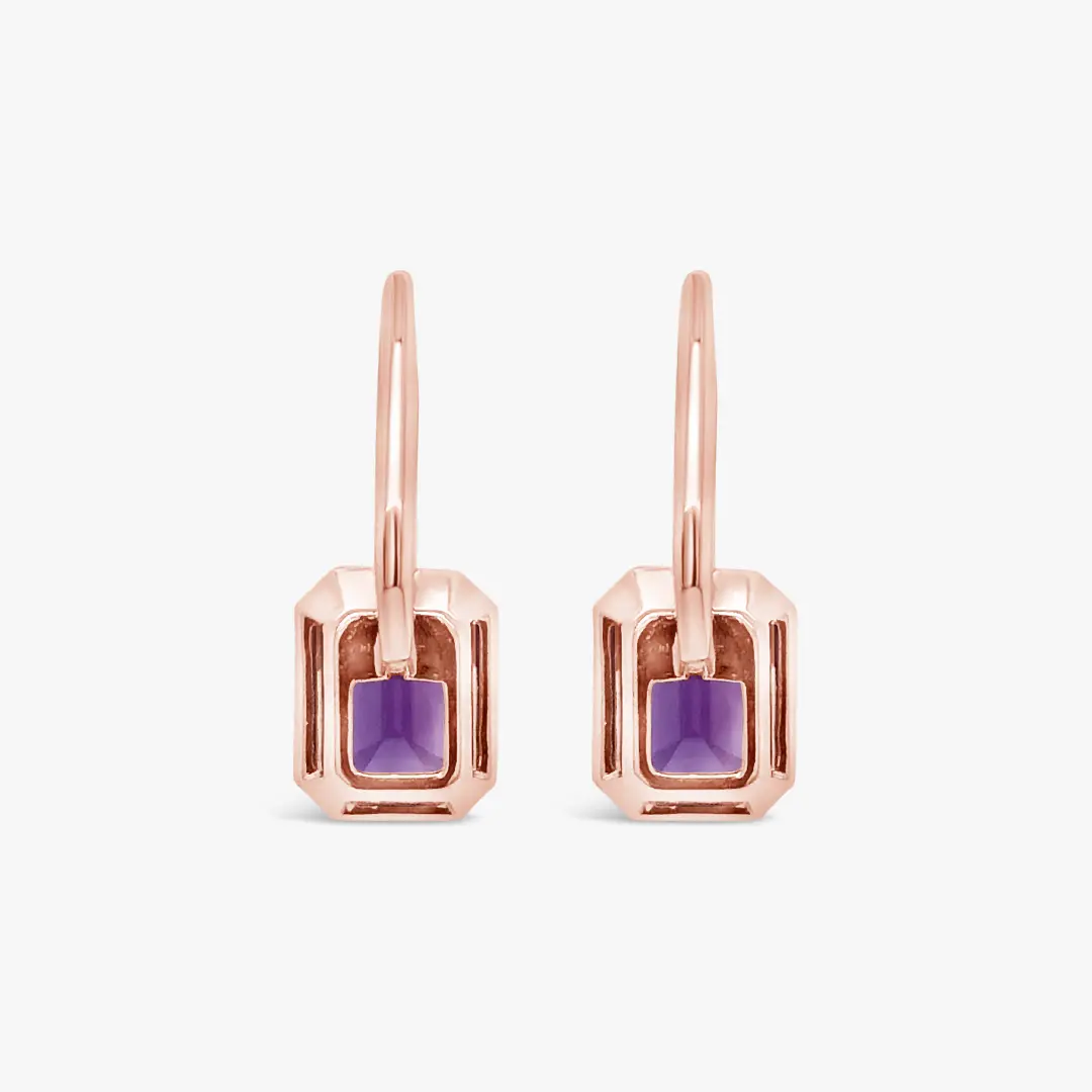 Una hilera de cuatro diamantes desciende con delicadeza hasta una amatista engastada al bisel, formando unos aretes en los que el color y la luz se equilibran en un diseño sutil sobre oro rosa de 18K.