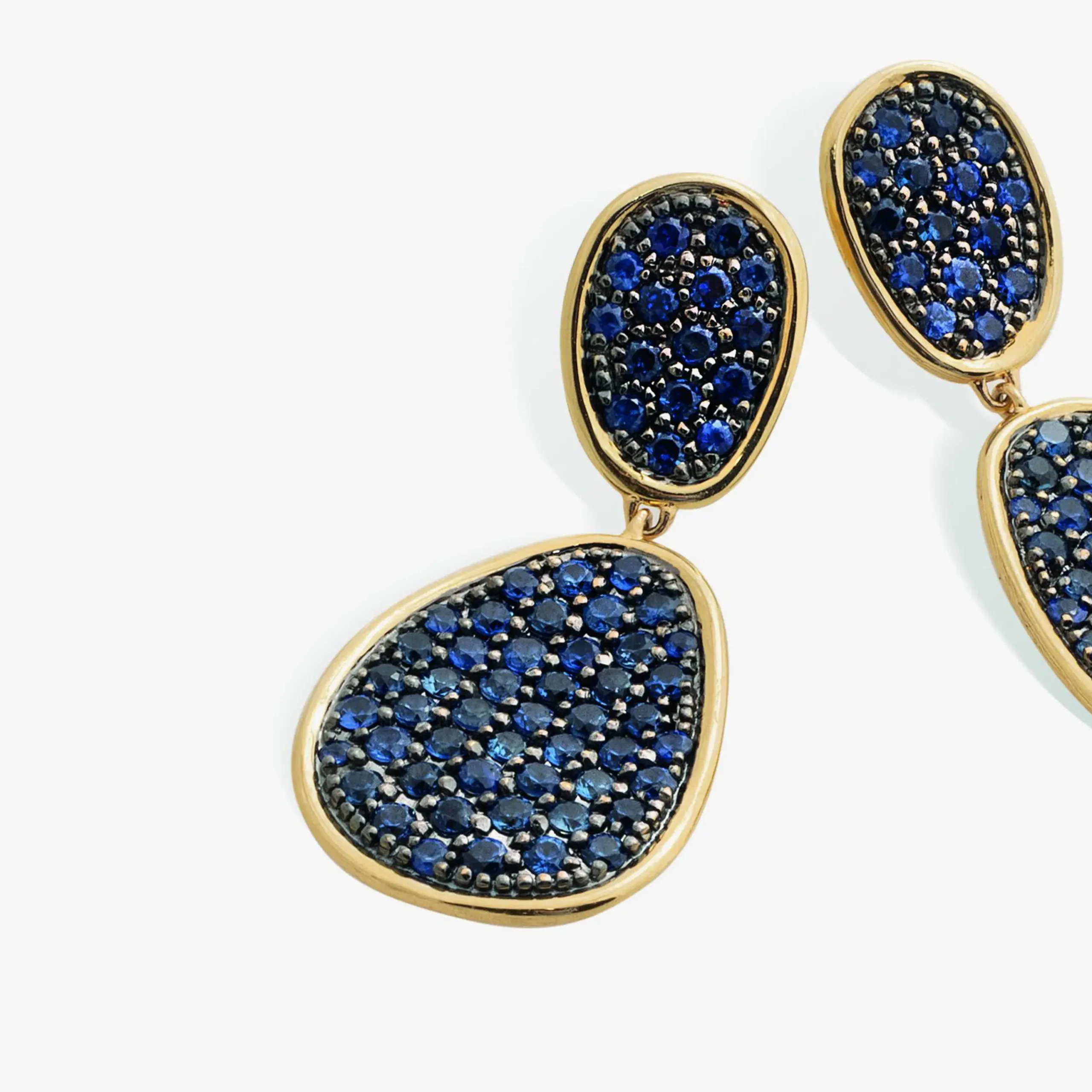 Creados en oro amarillo de 18 quilates, estos espectaculares aretes con gema y gota son sin duda una excelente pieza de joyería. Cada zafiro está cuidadosamente engastado en elegantes formas redondas y engastados en un engarce confiable.