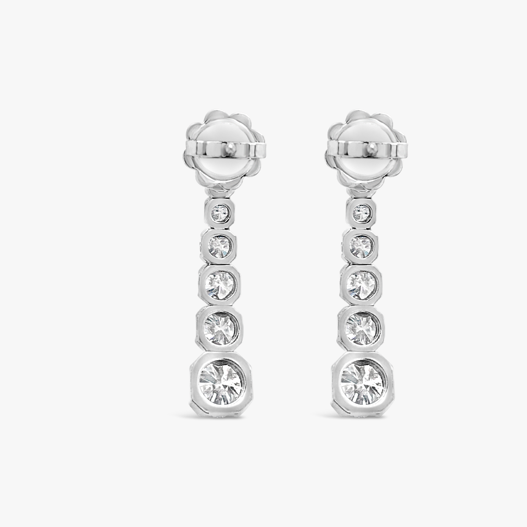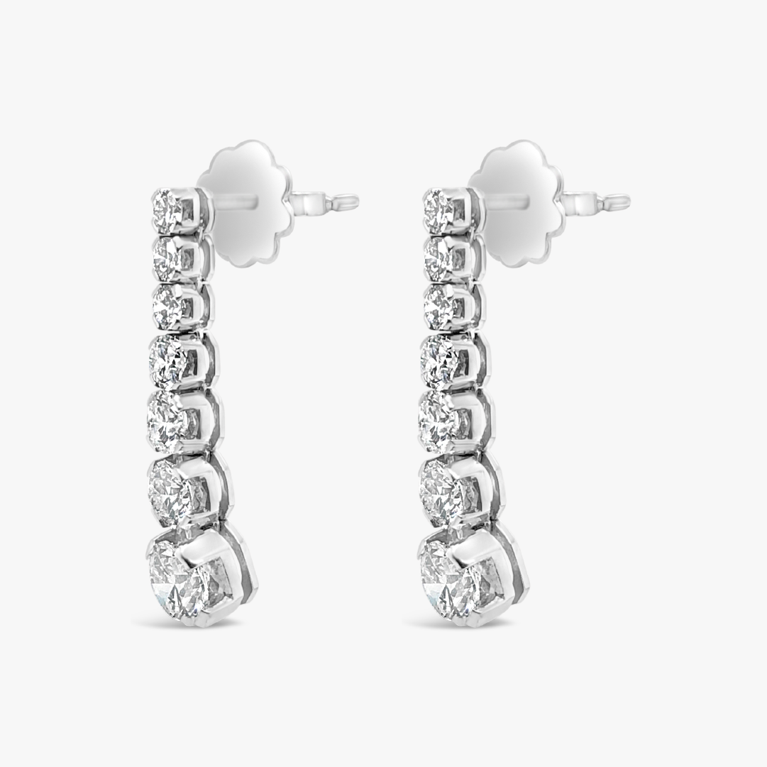 Estos aretes de oro blanco 18K cuelgan una hilera de diamantes en cada arete. Su orden de menor a mayor da un toque moderno y distinto a los clásicos aretes largos de diamantes.