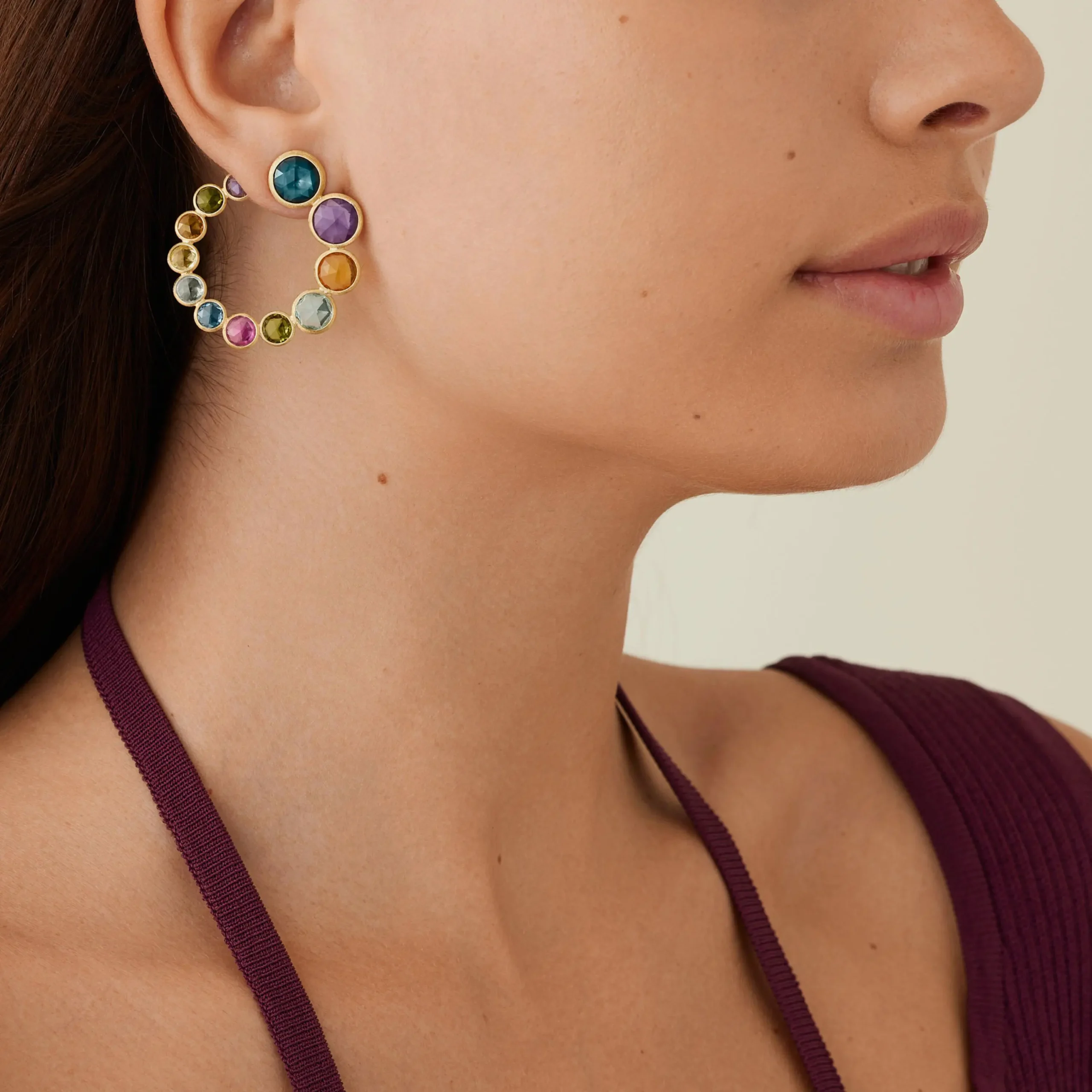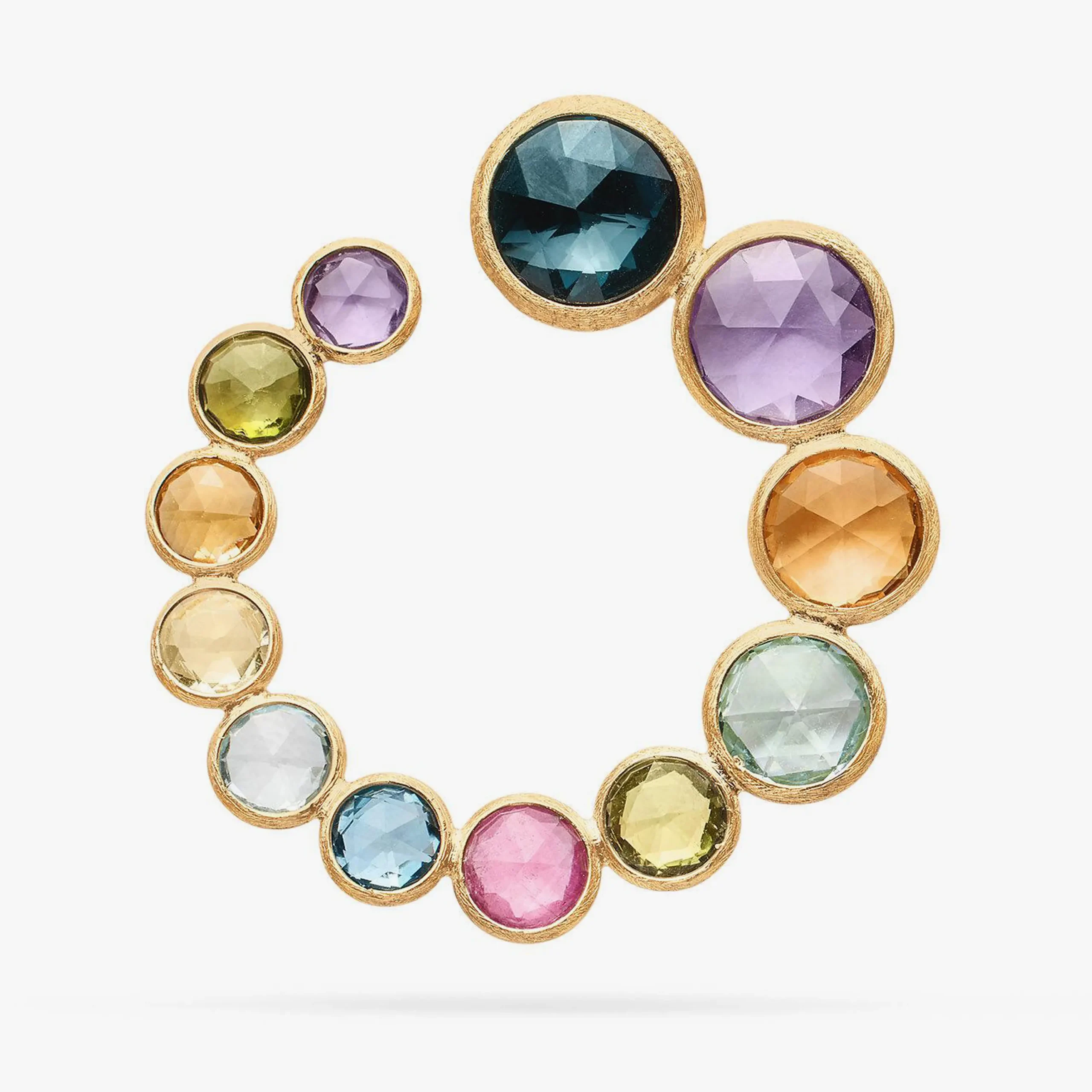 Gemas multicolores redondeadas de talla rosa, cuidadosamente seleccionadas, aportan carácter y brillo a estos impresionantes pendientes de la colección de alta joyería ALTA de Marco Bicego. El oro amarillo de 18 kt está finamente grabado a mano con la antigua técnica florentina.