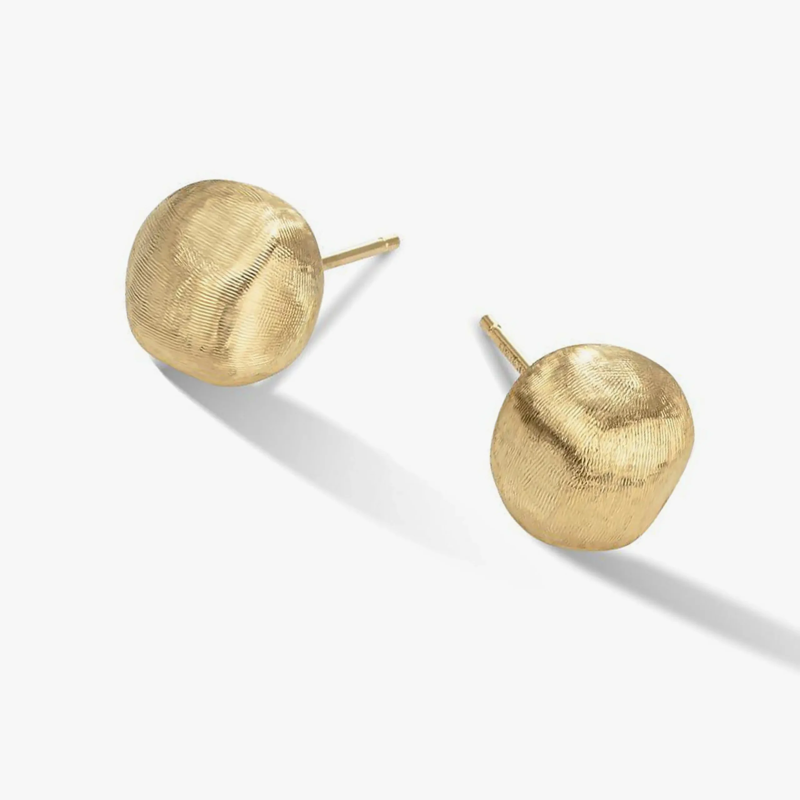 Imprescindibles, estos pendientes de botón de oro de 18K son discretos y elegantes, perfectos para el día a día. Su superficie está grabada a mano con una antigua técnica florentina que le confiere a nuestro oro una fina textura cepillada.