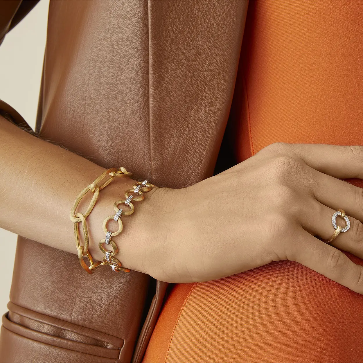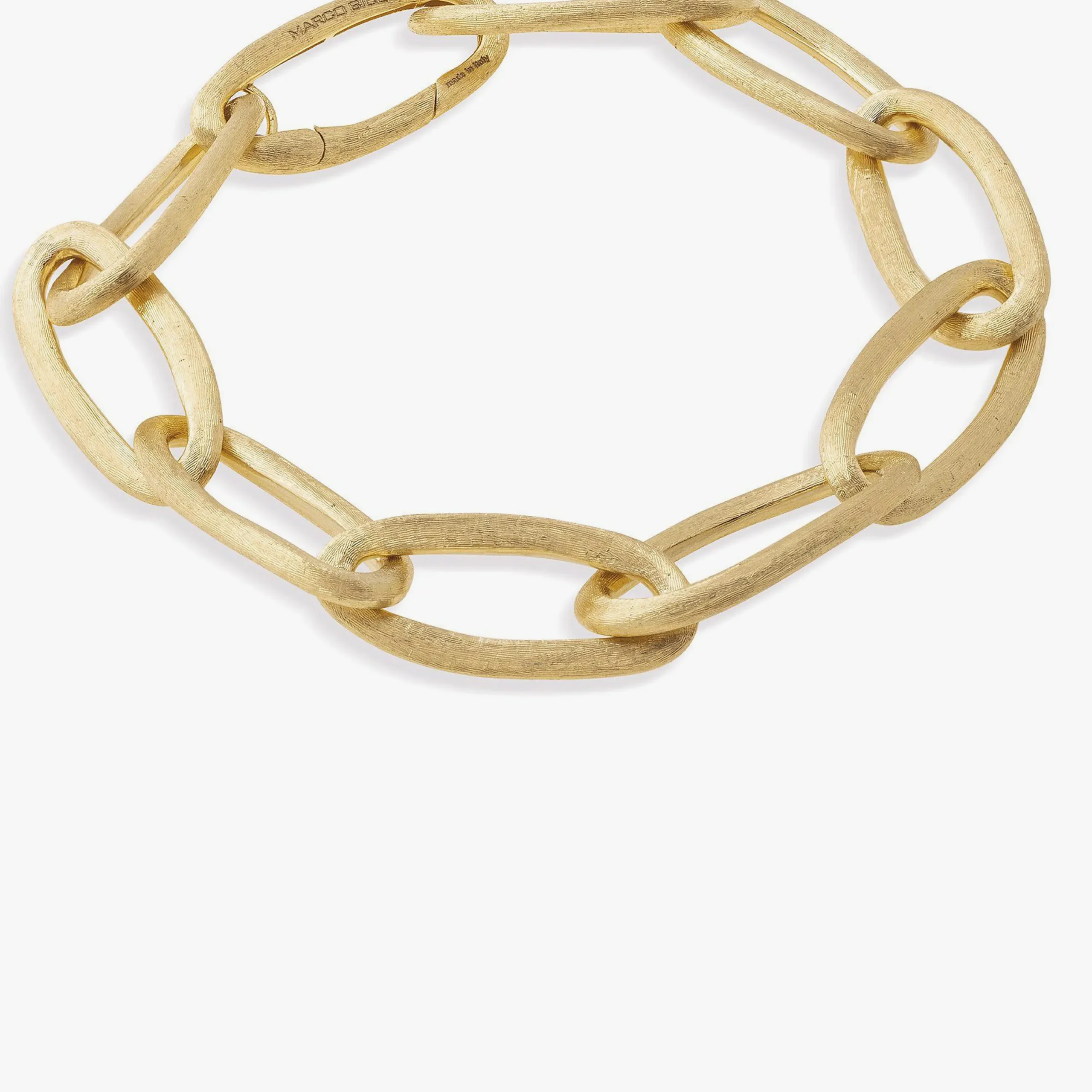 Esta pulsera, audaz a la vez que elegante, está compuesta por elementos ovalados en oro amarillo de 18 quilates, finamente grabados a mano utilizando la antigua técnica florentina que confiere a nuestro oro una textura fina y cepillada.