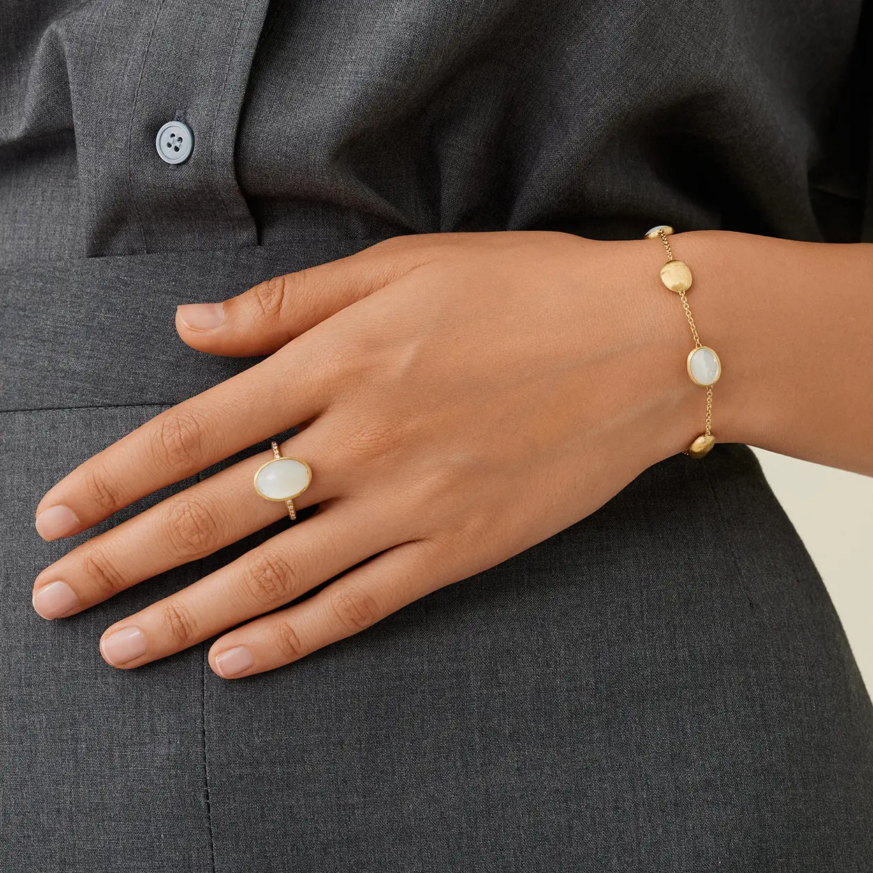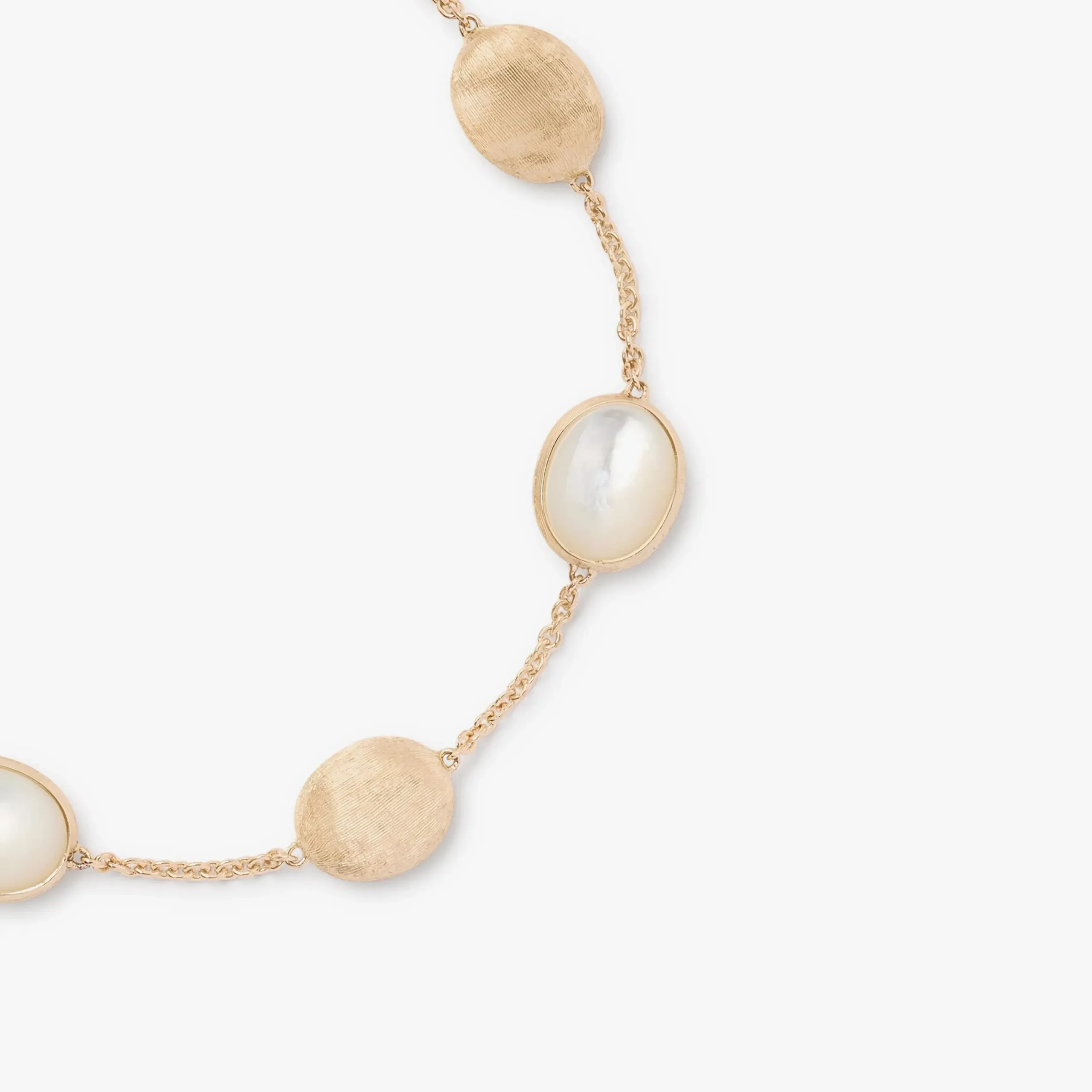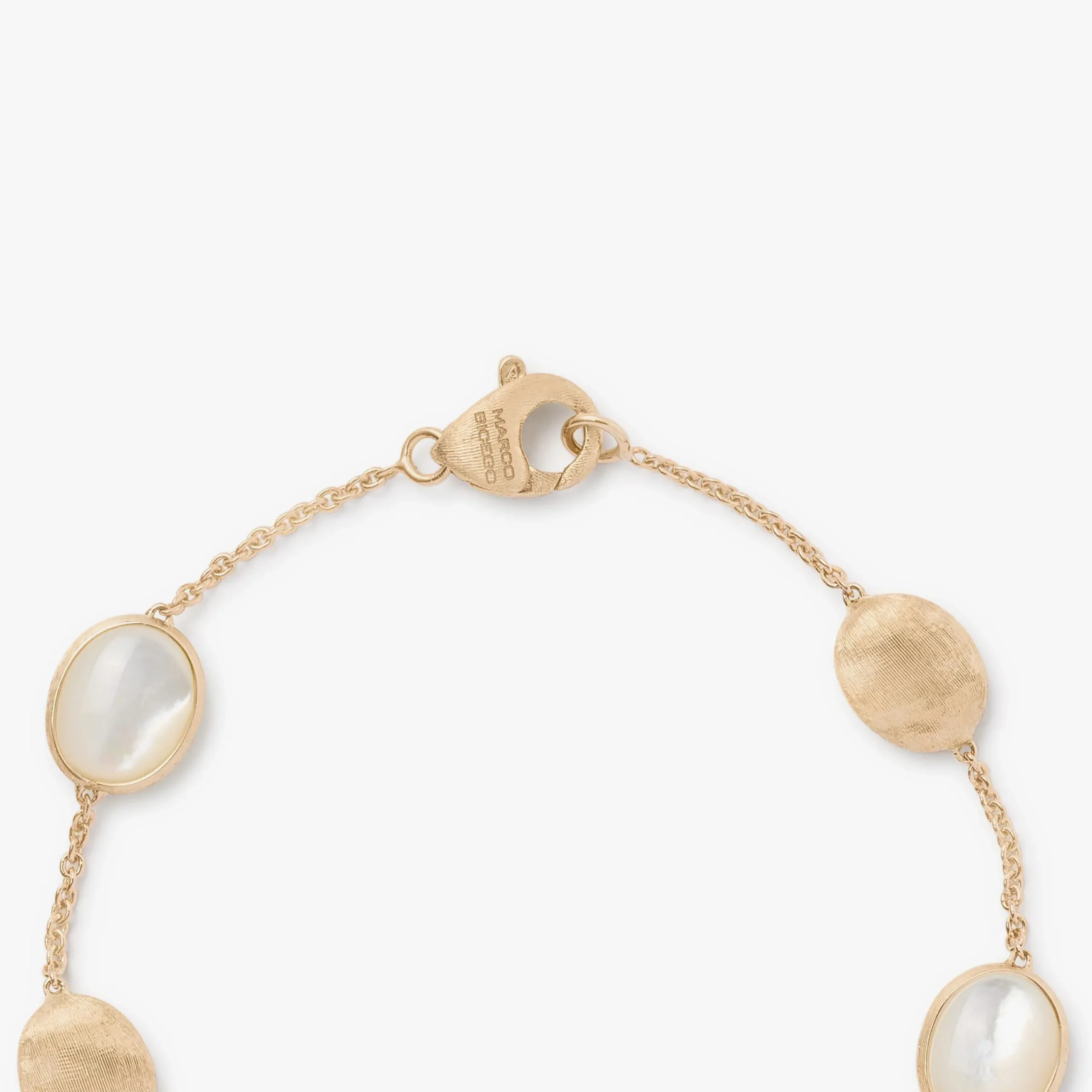 Elegante y atemporal, esta pulsera de oro amarillo de 18kt se compone de una finísima cadena que la convierte en la joya perfecta para llevar todos los días. Los nácares, seleccionados meticulosamente, se alternan con pequeños óvalos de superficie irregular de oro de 18 kt, las cuales se han grabado finamente a mano mediante la antigua técnica orfebre artesanal del buril mil rayas.