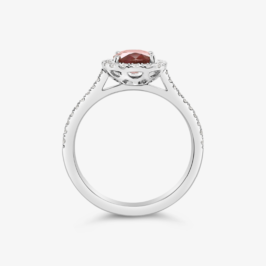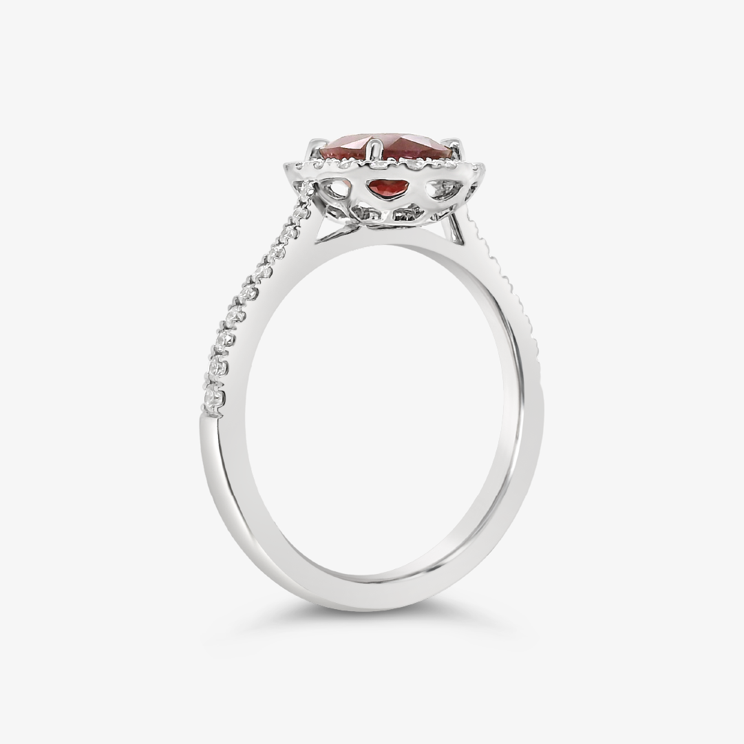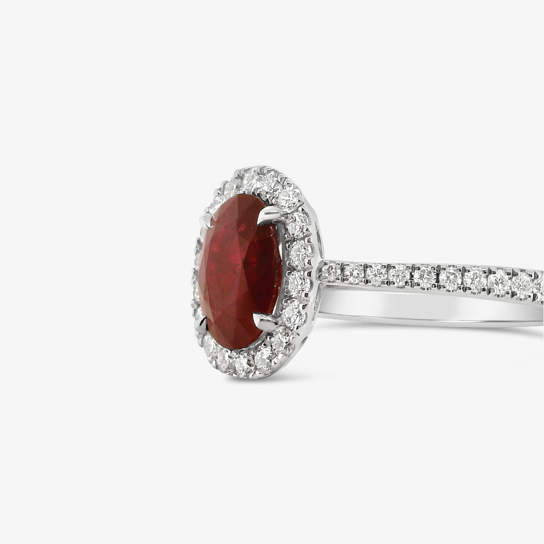 Un rubí de corte ovalado despliega su intensidad cromática en el centro, sujeto por cuatro uñas sobre una montura en oro blanco de 18 quilates. Un halo de diamantes corte brillante rodea la gema principal, mientras que la argolla engastada con diamantes prolonga el resplandor, dando vida a una pieza llena de equilibrio y distinción.