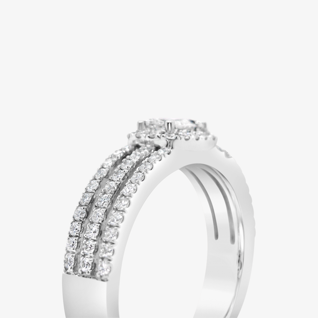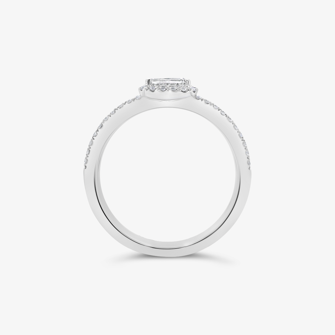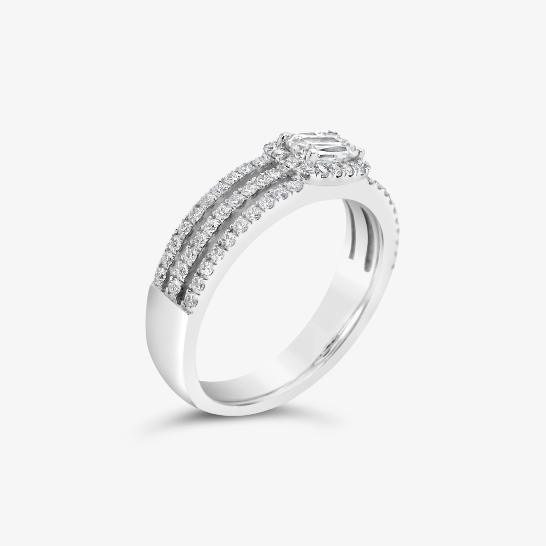 Este anillo en oro blanco de 18K destaca por la presencia de un diamante ASHOKA central, cuyo corte alargado y único atrae todas las miradas por su brillo excepcional. La piedra principal se eleva sobre un diseño de tres hileras de diamantes corte brillante.