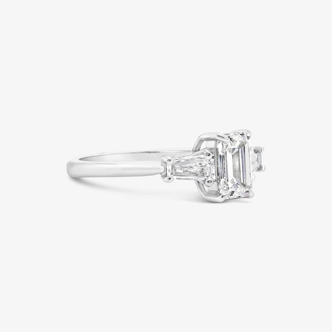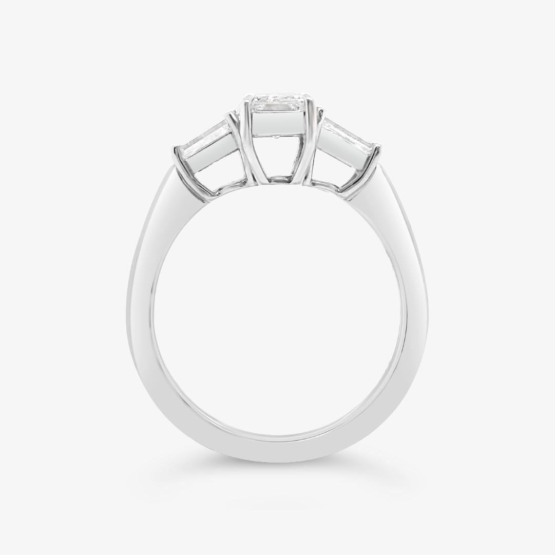 La pureza geométrica del corte esmeralda resplandece en el diamante central, acompañado a cada lado por dos diamantes corte baguette que realzan su silueta elegante. Montados en una argolla de oro blanco de 18 quilates, los tres elementos crean una composición equilibrada y refinada, donde la claridad y el brillo se combinan en perfecta armonía.
